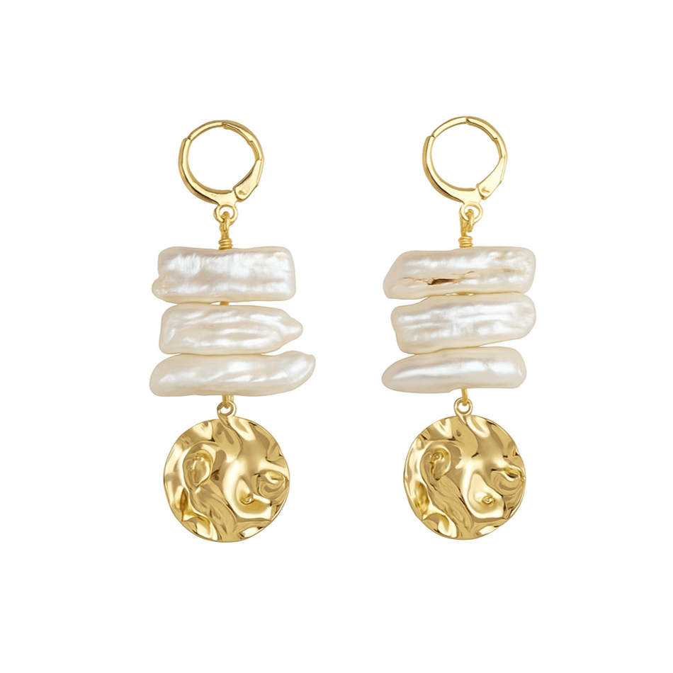 Aretes elaborados en chapa de oro de 14k, bordadas de forma artesanal con perlas y piedras naturales así como piezas chapeadas en oro.