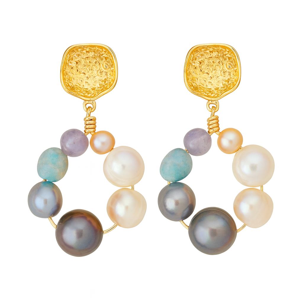 Arracadas elaboradas en chapa de oro de 14k, bordadas de forma artesanal con perlas naturales, piedras naturales y piezas chapeadas en oro.
