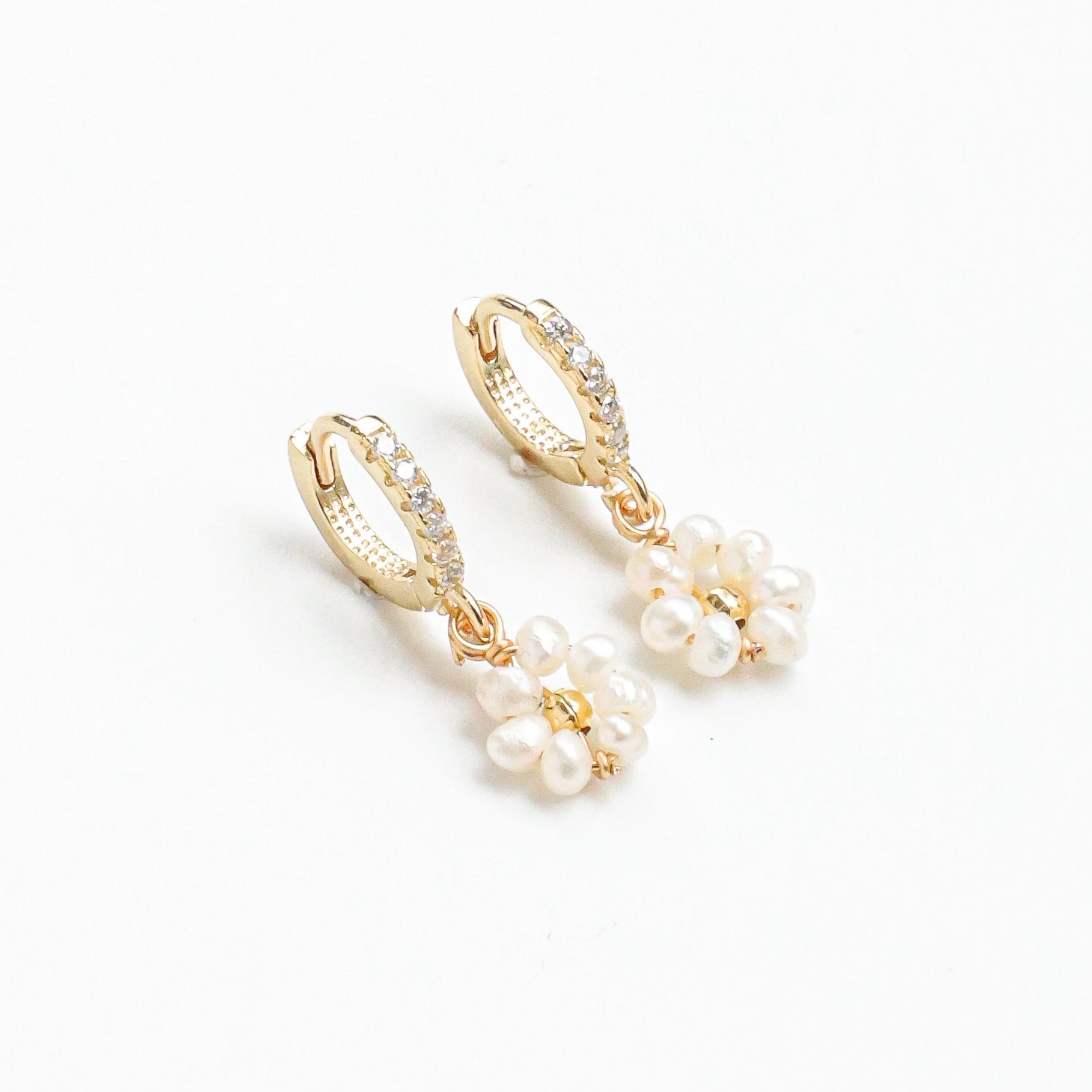 Arracadas elaboradas en acero con chapa de oro de 14k, bordadas de forma artesanal con perlas naturales
